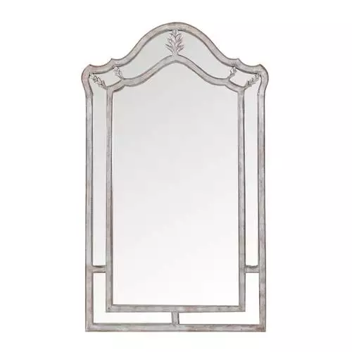 Specchio con cornice intagliata in legno di dal colore griogio con riflessi argento in stile shabby chic.