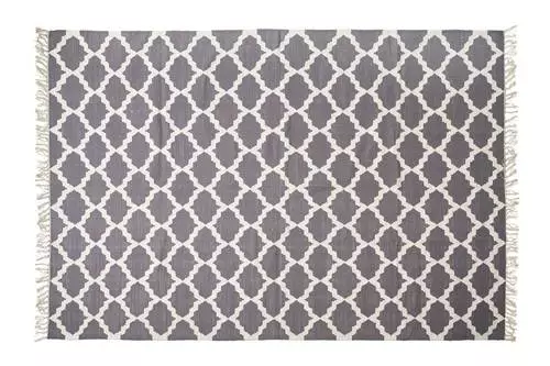 Tappeto in 100% cotone intrecciato bicolore grigio e bianco, disegno geometrico e finitura a frange.