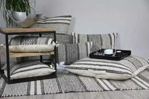 Tappeto da arredo intrecciato a telaio in 80% cotone e 20% iuta naturale.