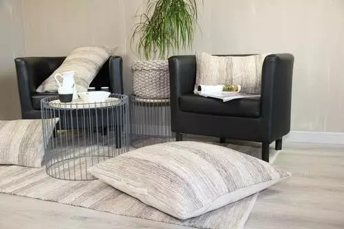 Tappeto da arredo intrecciato a telaio in 80% cotone e 20% iuta naturale.