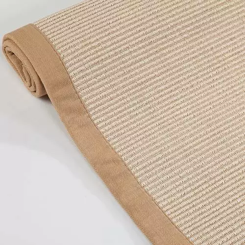 Tappeto intrecciato in fibra sintetica color naturale con bordo in cotone.