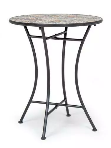 Tavolino tondo da giardino con struttura in acciaio nero trattato per l'esterno (e-coating) e verniciato a polvere epossidica, piano in ceramica colorato effetto piastrelle (gambe da assemblare).