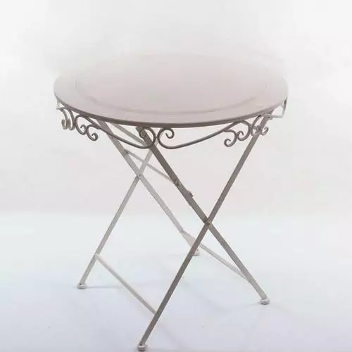 Tavolino in ferro battuto bianco con finiture anticate, bordo con lavorazione a riccioli in stile shabby, pratico da riporre e facilmente pieghevole.