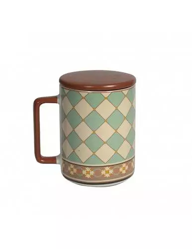 Tazza mug tisaniera con filtro in acciaio inox in porcellana della collezione Le cementine di Brandani, con decorazione di mix di stili che va dal geometrico al floreale, combinato in forme e colori che creano una grafica accattivante.
