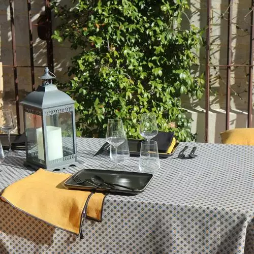 Tovaglia in cotone con rivestimento plastificato antimacchia, che permette la pulizia con un colpo di spugna.