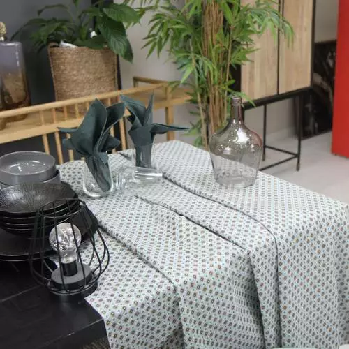 Tovaglia in cotone con rivestimento plastificato antimacchia, che permette la pulizia con un colpo di spugna.