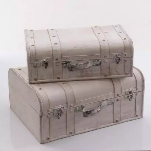 Scatola valigia in legno sbiancato effetto shabby, cinghie di finitura in ecopelle e chiusura in metallo.