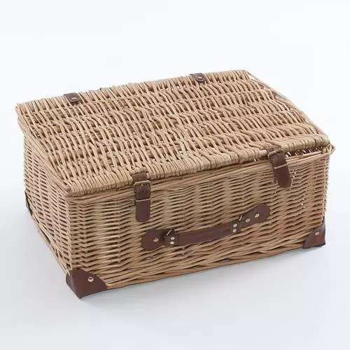 Cesto con coperchio a forma di valigia realizzato in vimini naturale, chiusura e maniglia in ecopelle.