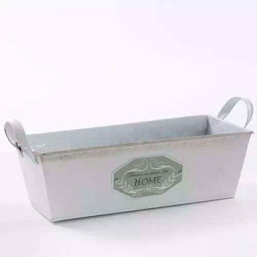 Portavasi rettangolare in latta bianca con finitura shabby anticata con manici.