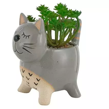 Vaso da arredo realizzato in ceramica dipinto a mano a forma gatto, dalle linee moderne, con pianta sintetica inclusa, simpatico oggetto d'arredo da interno per salotto, camera o bagno, decorazione chic e raffinata.
