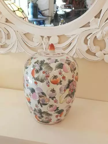 Vaso con coperchio d'arredo in porcellana decorata a mano in stile antica cina.