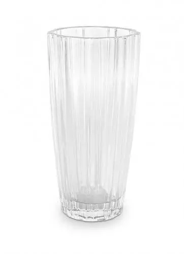 Vaso in vetro trasparente tondo di forma svasata con righe verticali a rilievo.