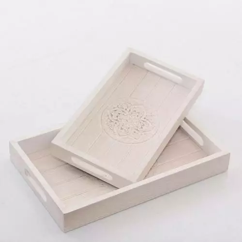 Vassoio rettangolare con maniglie in legno bianco decapato shabby con motivo di mandala inciso sul fondo.