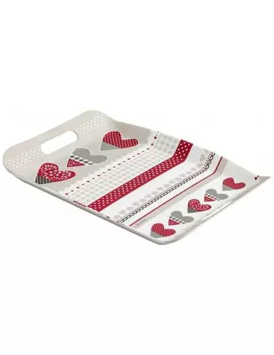 Vassoio in melamina con rivestimento antiscivolo collezione Happy Day di Brandani, con cuoricini rossi e disegni geometrici, per una colazione o pausa the /caffe' squisitamente romantica.