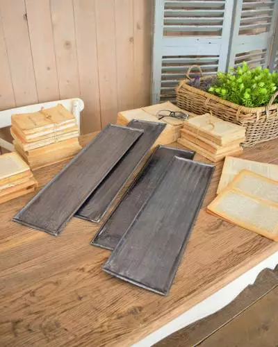 Vassoio rettangolare stretto e lungo in allumio lavorato a sbalzo.