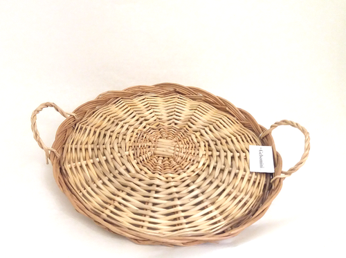 Vassoio tondo intrecciato in vimini naturale con bordo basso e manici, realizzato senza l'ultilizzo di vernici e colle, adatto per il contatto con generi alimentari, quali dolci, pasta fresca, pane e frutta e verdura.
