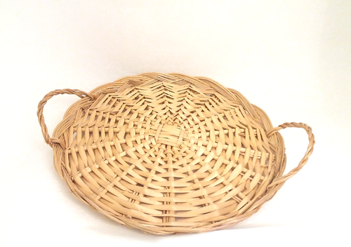 Vassoio tondo intrecciato in vimini naturale con bordo basso e manici, realizzato senza l'ultilizzo di vernici e colle, adatto per il contatto con generi alimentari, quali dolci, pasta fresca, pane e frutta e verdura.