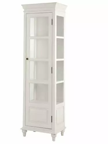Vetrinetta in legno di abete verniciato bianco con 1 anta in vetro, 4 ripiani e laterali in vetro.