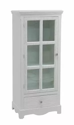 Vetrinetta a 1 anta + 1 cassetto in legno di pino verniciato in bianco-crema con effetto decapato, pomoli a forma di rosellina.