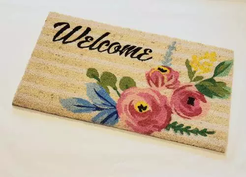 Zerbino da esterno o interno in alta qualità realizzato in 100% cocco colorato a spazzola dipinto a mano con stencil, ideale da utilizzare sull'ingresso di una porta, di una terrazza o di un giardino. Sottofondo in gomma antiscivolo. Prodotto facile da pulire co aspirapolvere, spazzola o battipanni.