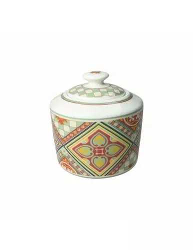 Zuccheriera in porcellana collezione Le cementine di Brandani, con decorazione di mix di stili che va dal geometrico al floreale, combinato in forme e colori che creano una grafica accattivante.