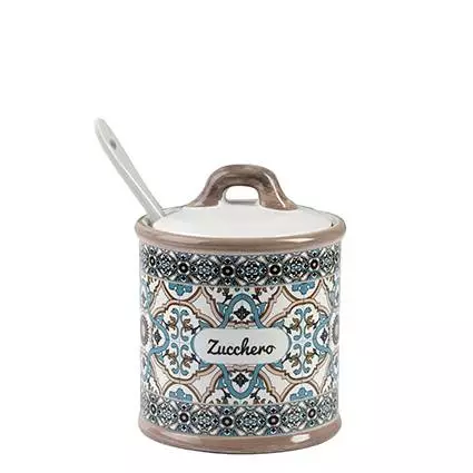 Zuccheriera con cucchiaino in ceramica colorata con decorazione ispirata alla Sicilia e all'azzurro del mare Mediterraneo